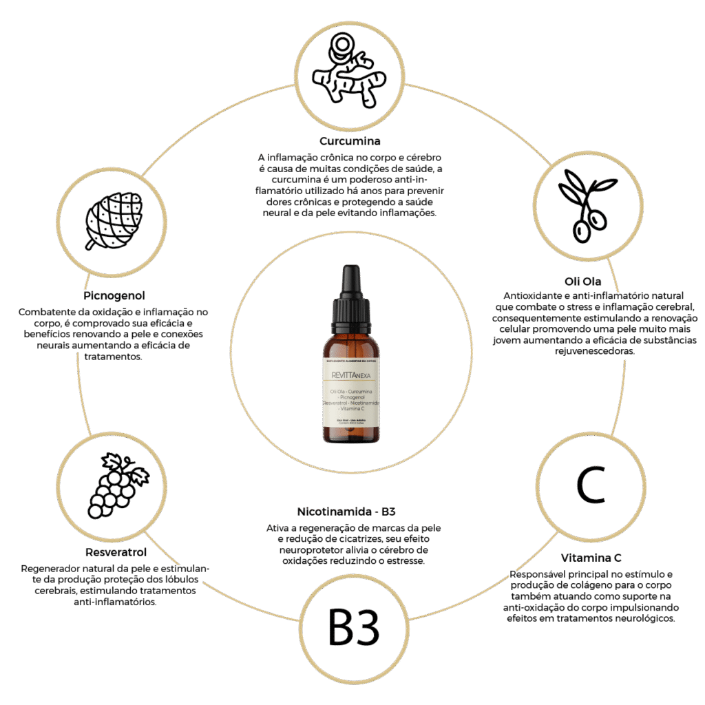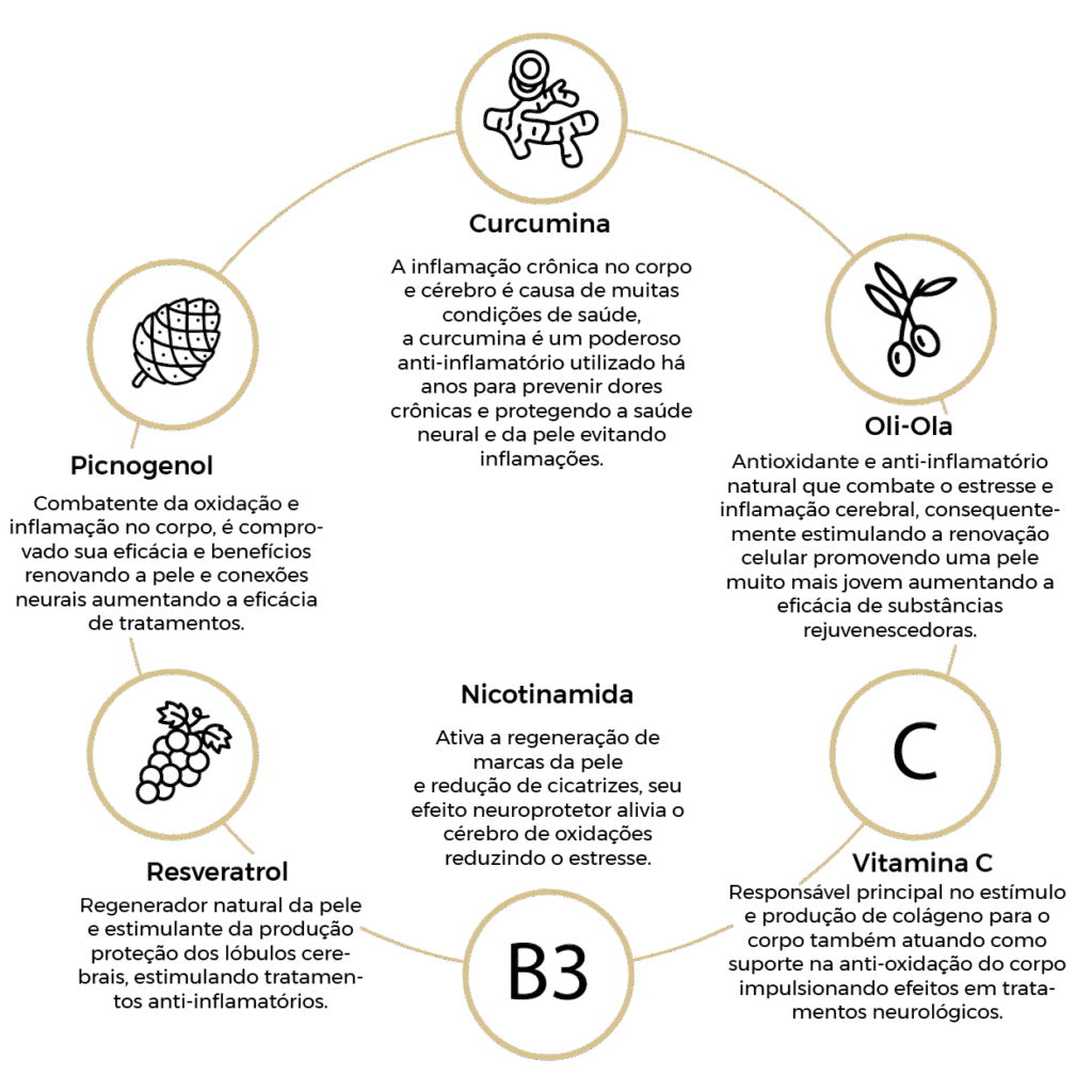 A Nicotinamida é utilizada há anos no combate da degeneração neural, com seu potencial protegendo e reconstruindo neurônios, promovendo reparação do DNA. Picnogenol - Anti-inflamatório natural que protege os neurônios do estresse do dia-a-dia, evitando o desgaste cerebral e melhorando sua cognição.